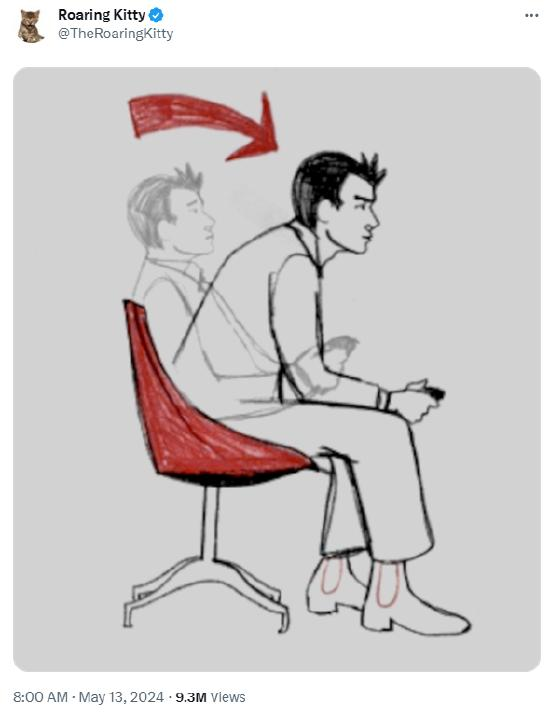 Roaring Kitty此次回归的首个帖子是一张“男子在椅子上前倾”的素描,这是游戏玩家中非常流行的meme(模因),暗示事情正在变得严肃起来。这也是他自2021年年中以来,在X平台上发布的第一篇帖子。