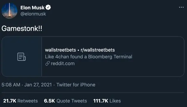 Musk曾在个人推特上转发WallStreetBets论坛的讨论,并故意将游戏驿站GameStop错拼为“Gamestonk!!”以表达对这一事件的调侃。
