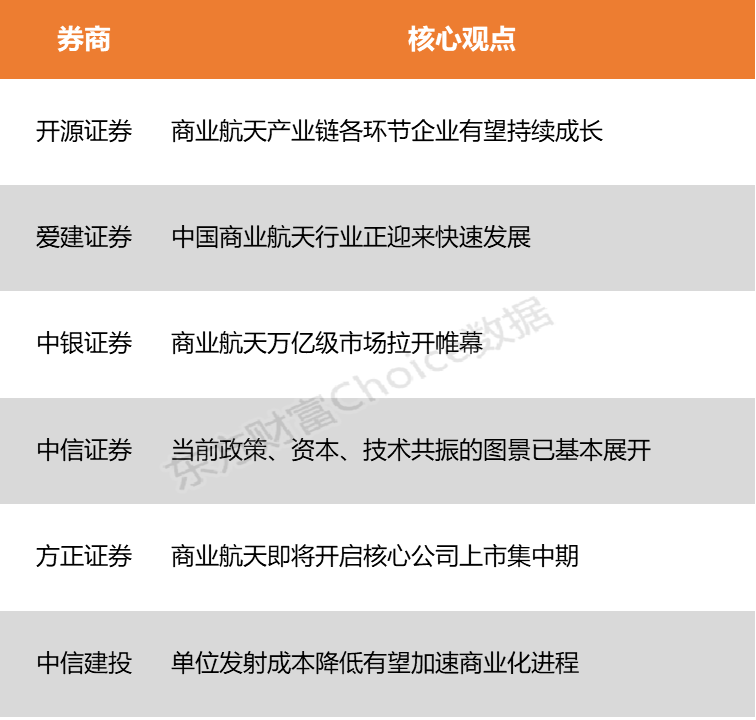 开源证券表示,商业航天领域受益于国家战略支持和技术突破,产业链各环节企业有望持续成长。卫星制造、火箭发射、地面设备等细分市场将迎来发展机遇。爱建证券指出,中国商业航天行业正迎来快速发展,行业整体向高可靠性、低成本商业化方向迈进。