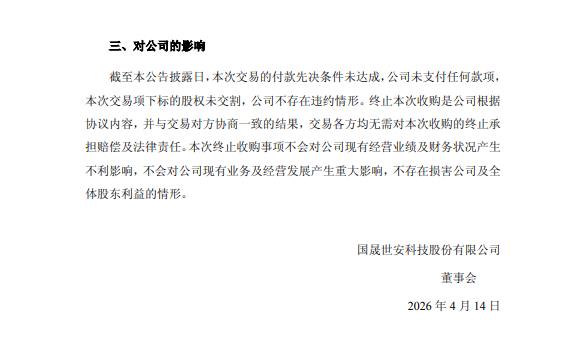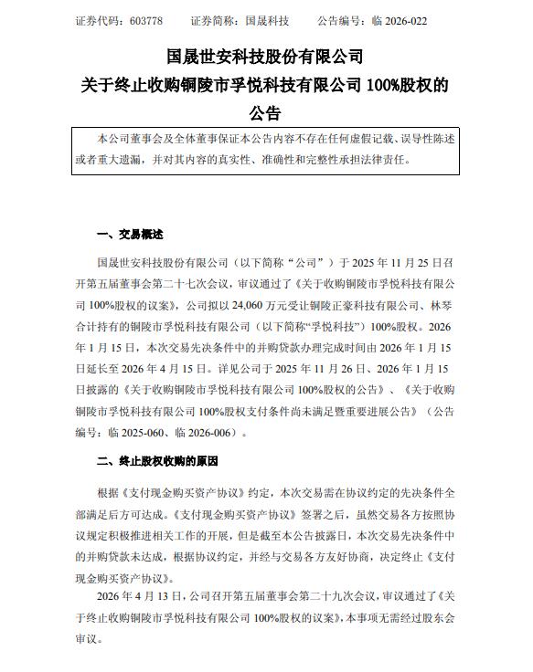 4月13日,国晟科技公告,此前公司公告,拟以2.41亿元受让铜陵正豪科技有限公司、林琴合计持有的铜陵市孚悦科技有限公司100%股权。由于本次交易先决条件中的并购贷款未达成,公司决定终止收购。截至公告披露日,公司未支付任何款项,本次交易项下标的股权未交割,公司不存在违约情形。终止本次收购不会对公司现有经营业绩及财务状况产生不利影响。