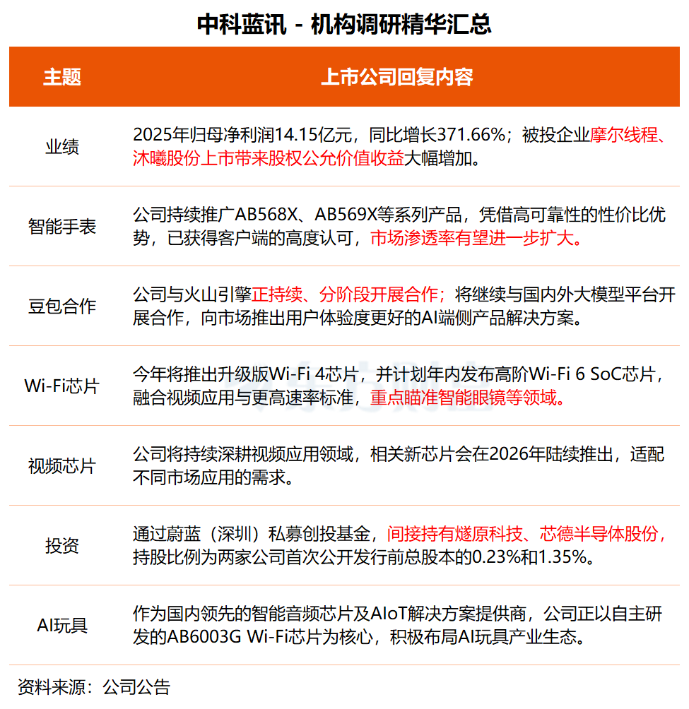 中科蓝讯近日接待中金公司、宝盈基金、财通资管等36家机构调研,就2025年经营业绩、产品布局、AI端侧应用、WiFi芯片进展等核心问题进行交流。