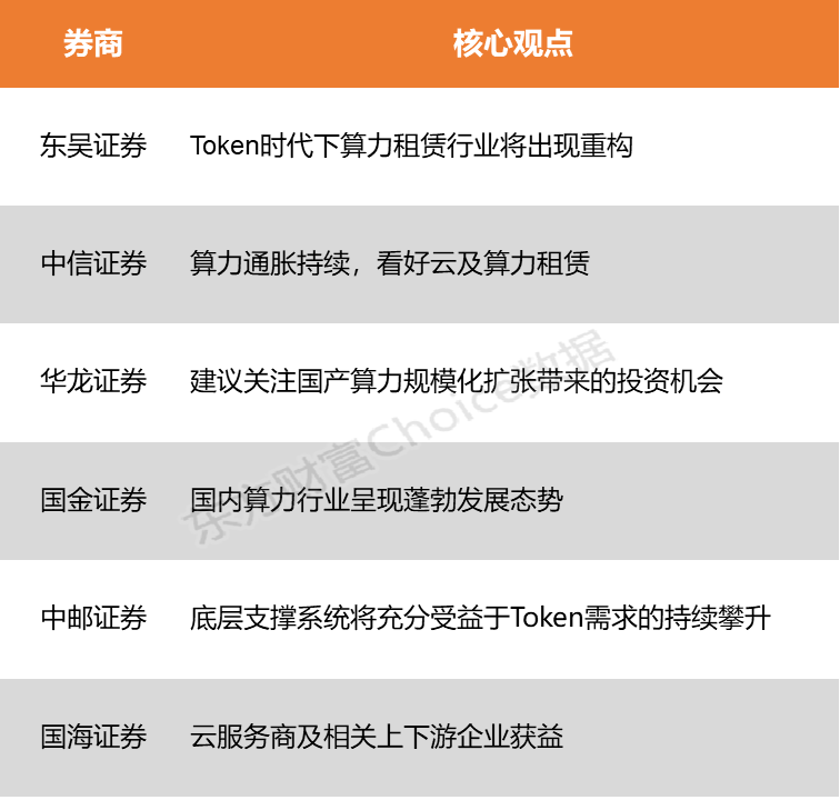 东吴证券表示,能够提供稀缺高端算力服务的算力租赁厂商,将成为以Token为中心的新时代中,各家云厂商、大模型公司及应用企业竞相争夺的核心战略资源。中信证券指出,Agent&多模态等应用爆发驱动Token调用量井喷,进而导致国内算力荒,国产大模型在推理端积极适配为国产算力厂商带来加速放量机遇。