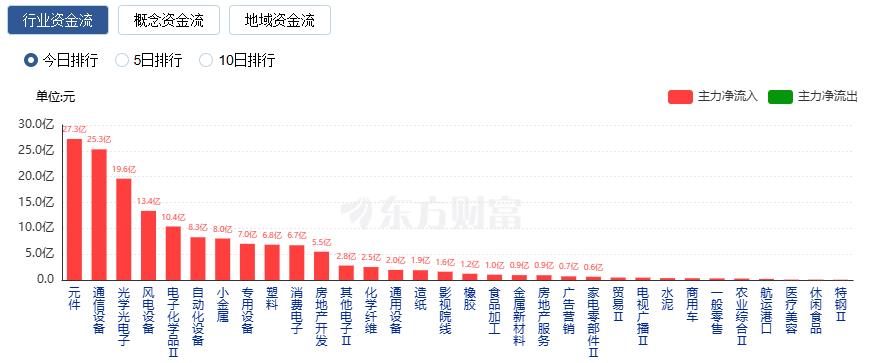 行业资金方面,截至收盘,元件、通信设备、光学光电子等净流入排名靠前,其中元件净流入27.30亿。