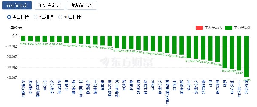 净流出方面,医疗服务、IT服务、光伏设备等净流出排名靠前,其中医疗服务净流出39.37亿元。