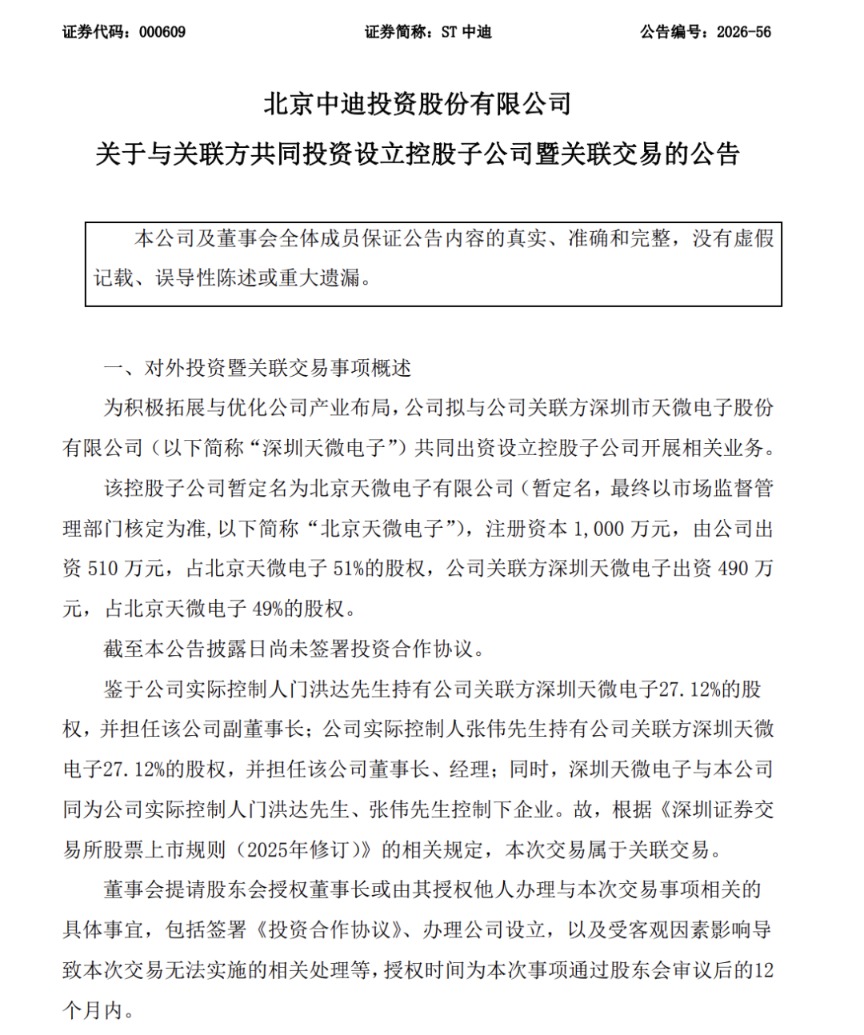ST中迪表示,公司拟与公司关联方深圳天微投资设立新的业务平台,旨在充分利用北京市在区位、人才方面的优势,推动公司半导体业务发展,符合公司发展战略。