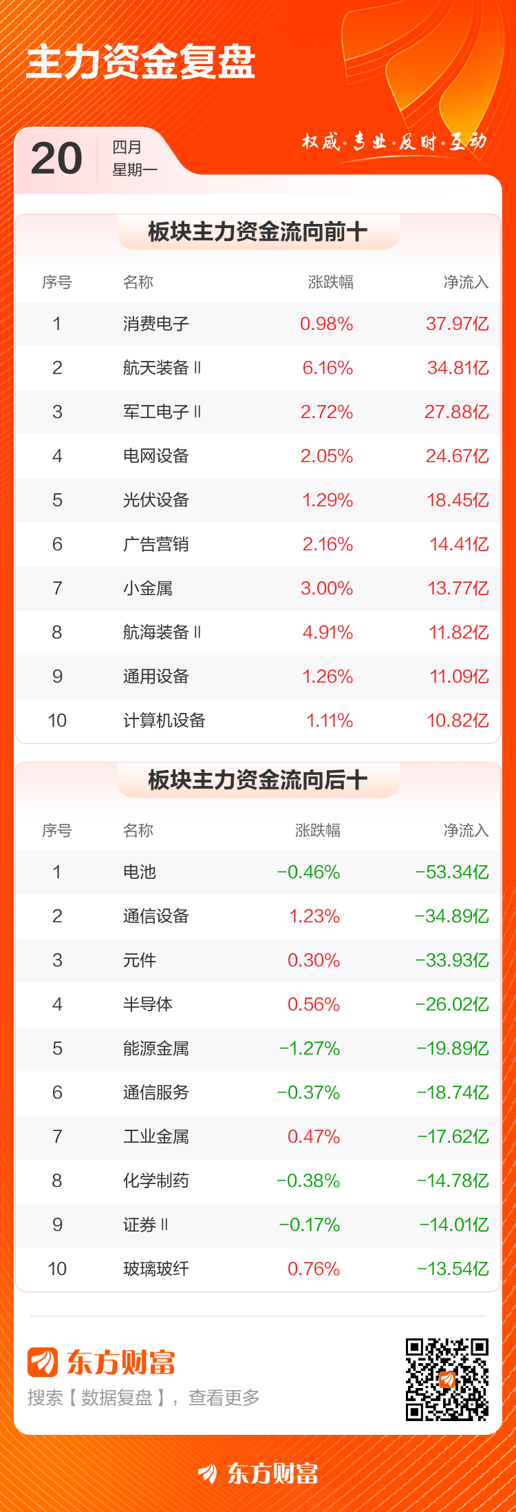 4月20日,沪指涨0.76%,深成指涨0.55%,创业板指跌0.02%。两市成交额2.58万亿,较上个交易日放量1532亿。数据显示,今日大盘主力资金净流出134.47亿。消费电子、航天装备Ⅱ、军工电子Ⅱ等板块主力资金流入排名居前,其中消费电子净流入37.97亿元。