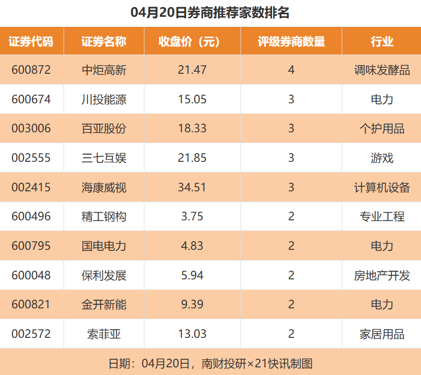 从券商推荐家数来看,4月20日有97家上市公司得到券商推荐,其中中炬高新获得4家推荐,川投能源、三七互娱、海康威视等获得3家推荐。