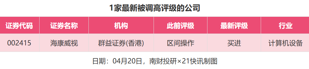 评级调高方面,4月20日,券商调高1家上市公司评级,群益证券(香港)对海康威视的评级从“区间操作”调高至“买进”。