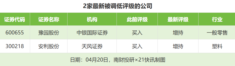 评级调低方面,4月20日,券商调低2家上市公司评级,中银国际证券对豫园股份的评级从“买入”调低至“增持”,天风证券对安利股份的评级从“买入”调低至“增持”。