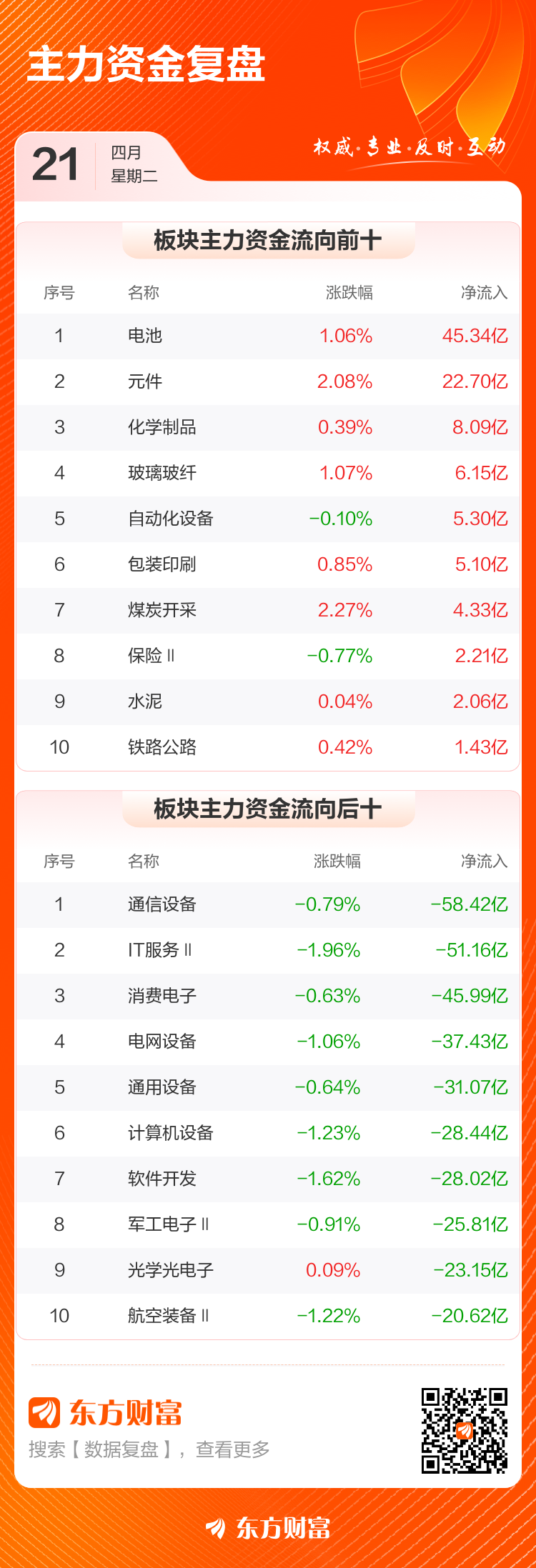 4月21日,沪指涨0.07%,深成指涨0.1%,创业板指涨0.31%。两市成交额2.41万亿,较上个交易日缩量1702亿。数据显示,今日大盘主力资金净流出532.23亿。电池、元件、化学制品等板块主力资金流入排名居前,其中电池净流入45.