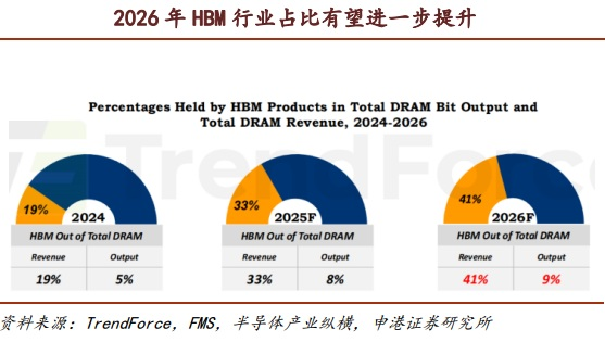 从产品类别来看,2025年的主流产品是HBM3e,部分AI芯片公司使用HBM3或HBM2e,2026年的主流产品仍将是HBM3e,堆叠的DRAM芯片数量或将从8个增加到12个。2025年HBM出货及销售额占DRAM的比例将进一步提升,出货量提升至8%、销售额占比将提升至33%,至2026年两项占比有望进一步提升。