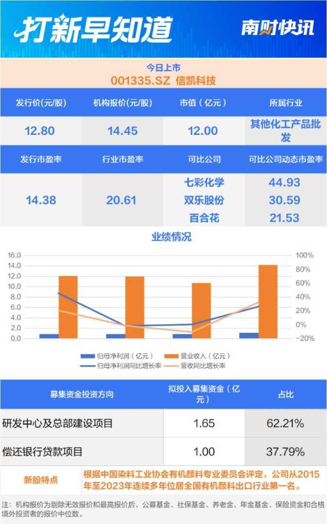 4月15日,创业板众捷汽车和深证主板江顺科技进行新股申购,同时深证主板信凯科技上市。众捷汽车专注汽车热管理系统零部件,江顺科技致力于铝型材挤压模具及配件,信凯科技为着色剂专业供应商,业务遍及全球。