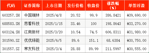 与此同时,中国瑞林、思看科技、江南新材、优优绿能、常友科技等5只新股,首日单签浮盈均超过3万元。4月8日,中国瑞林上市,发行价格为20.52元/股,首日股价收报99.9元/股,涨幅386.84%。1月15日,思看科技上市,发行价格为33.46元/股,首日股价收报100元/股,涨幅198.86%。