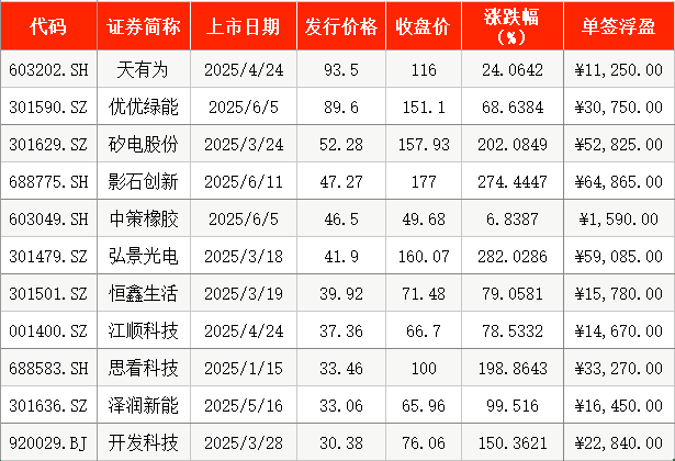 高价股方面,今年上半年,发行价格超过30元/股的新股,首日单签浮盈仅1只未超过万元。其中,年内至今发行价格最高的“最贵新股”天有为,发行价格为93.5元/股,首日收报116元/股,涨幅为24.06%,首日单签浮盈为1.13万元。不过,6月5日上市、发行价为46.5元/股的中策橡胶,首日单签浮盈未能过万,截至首日收盘报49.68元/股,首日单签浮盈为1590元,也是2025年上半年首日单签浮盈最低的新股。