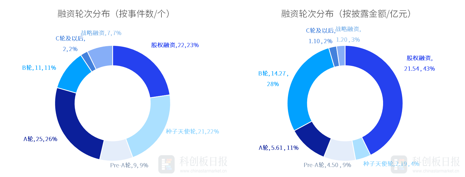 热门投资轮次中,A轮融资事件数最多,股权融资总额最高。
