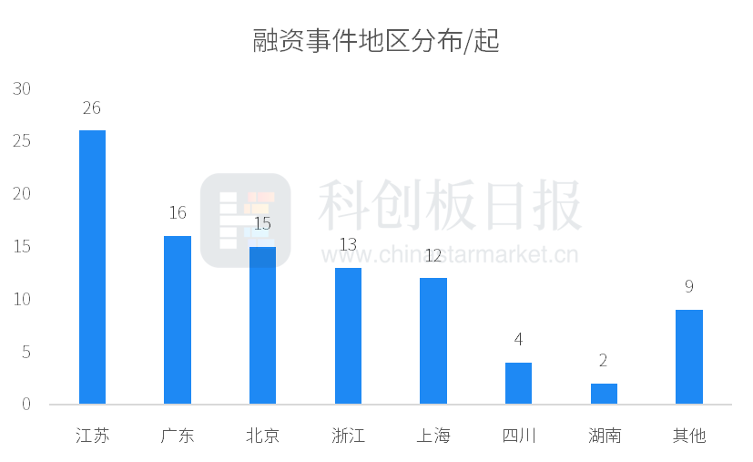 活跃投融资地区中,江苏、广东等地公司较受青睐,江苏以26起融资领先。