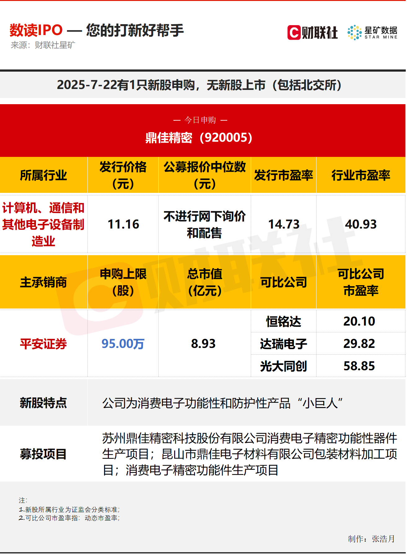 财联社7月22日讯,今日有1只新股申购,为北交所的鼎佳精密;无新股上市。