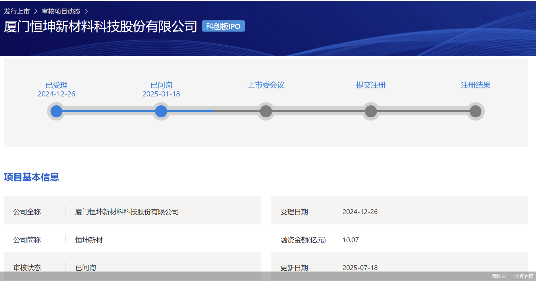 IPO排队近七个月后,厦门恒坤新材料科技股份有限公司(以下简称“恒坤新材”)即将迈入冲击A股的下一关键节点,公司将于7月25日上会迎考。