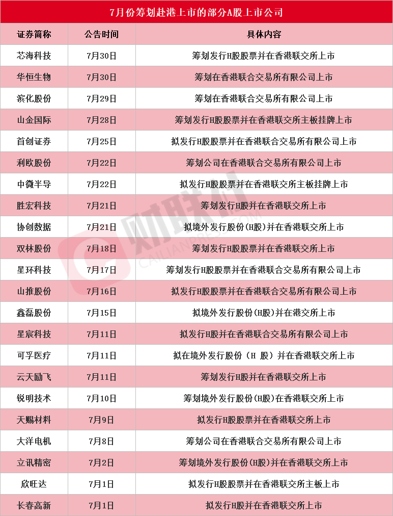 财联社8月2日讯 A股公司赴港上市热潮延续。据财联社不完全统计,截至发稿,7月份包括芯海科技、华恒生物、滨化股份、山金国际、首创证券、利欧股份、中微半导、胜宏科技、协创数据、双林股份、星环科技、山推股份、鑫磊股份、星宸科技、可孚医疗、云天励飞、锐明技术、天赐材料、大洋电机、立讯精密、欣旺达和长春高新在内的22家A股上市公司披露筹划赴港上市,详细情况见下图: