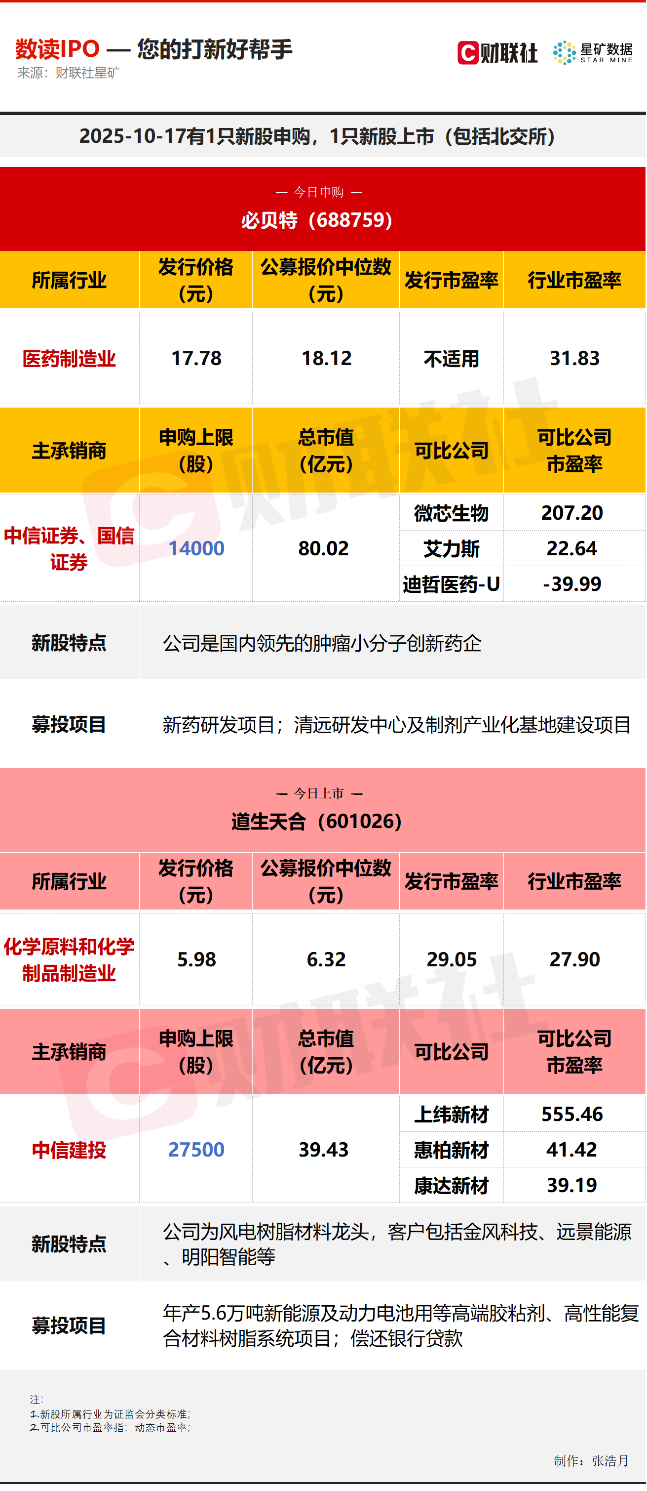 财联社10月17日讯,今日科创板必贝特新股申购,沪市主板道生天合新股上市。必贝特专注肿瘤小分子创新药,道生天合为风电树脂材料龙头,两者业绩表现备受关注。