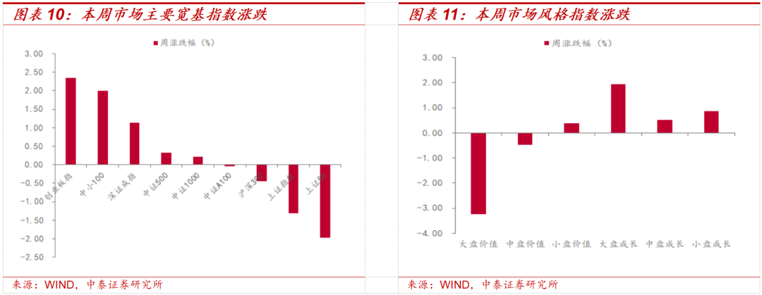 本周市场主要指数涨跌不一,创业板指上涨幅度较大,三大指数中上证指数下跌1.30%,深证成指和创业板指分别上涨1.14%和2.34%。大类行业方面,可选消费指数、信息技术指数和工业指数上涨明显,金融指数、日常消费指数跌幅较大。一级行业涨跌不一,电力设备及新能源、煤炭、消费者服务领涨市场。情绪指标显示,全A换手率较上周有所下降,5日平均换手率达2.26%,处于十年分位的97.8%;创业板指换手率有所下降,5日平均换手率为3.77%,处于历史分位的94.9%。估值指标方面,PB估值中煤炭、有色金属、机械等行业估值水平高于历史中位数;PE估值中化工、钢铁、电子等行业估值水平高于历史中位数。风险提示:全球流动性超预期收紧,市场博弈复杂性超预期,政策变化节奏复杂性超预期。