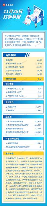 今日有1只新股百奥赛图进行申购,发行价格为26.68元/股。投资者需注意,不能随意弃购或闭眼打新,以免影响打新资格。