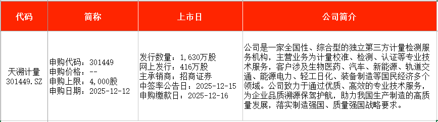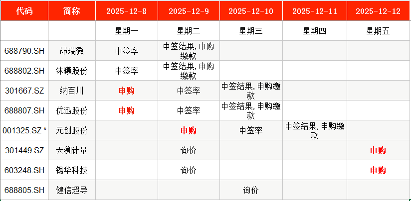 从时间表看,纳百川(301667)、优讯股份(688807)将在本周一(12月8日)申购;元创股份(001325)将在本周二(12月9日)申购;天溯计量(301449)、锡华科技(603248)均在本周五(12月12日)申购。
