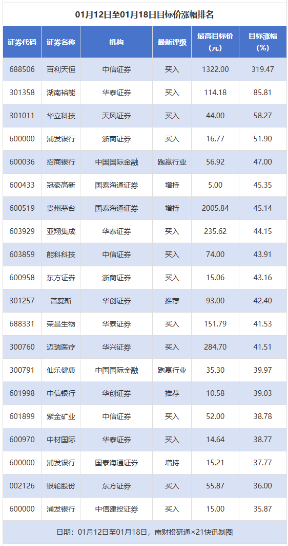 南财投研通数据显示,1月12日至1月18日,券商给予上市公司目标价共92次,按最新收盘价计算,目标价涨幅排名居前的公司有百利天恒、湖南裕能、华立科技,目标价涨幅分别为319.47%、85.81%、58.27%,分别属于化学制药、电池、文娱用品行业。