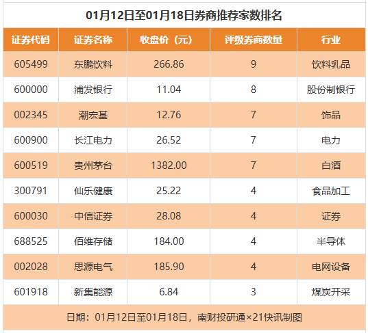 从券商推荐家数来看,1月12日至1月18日有191家上市公司得到券商推荐,其中东鹏饮料获得9家推荐,浦发银行获得8家推荐,潮宏基、长江电力、贵州茅台等获得7家推荐。