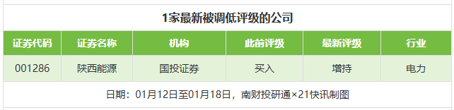 评级调低方面,1月12日至1月18日,国投证券对陕西能源的评级从“买入”调低至“增持”。