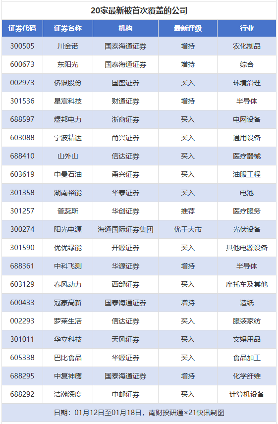 首次覆盖方面,1月12日至1月18日券商共给出了60次首次覆盖,其中川金诺、东阳光均获得国泰海通证券给予“增持”评级,侨银股份获得国盛证券给予“买入”评级,星宸科技获得财通证券给予“增持”评级,煜邦电力获得浙商证券给予“买入”评级。