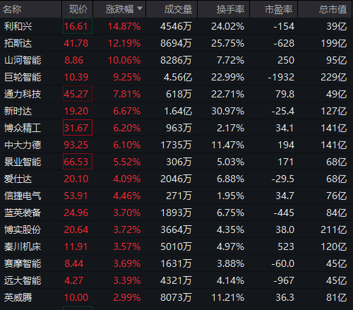 机器人概念股局部反弹,拓斯达涨超12%,创历史新高。同时,山河智能涨停,巨轮智能、通力科技、新时达等个股也纷纷跟涨。