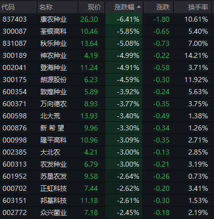 农业股今日集体回调,康农种业、荃银高科、秋乐种业等个股跌超5%。