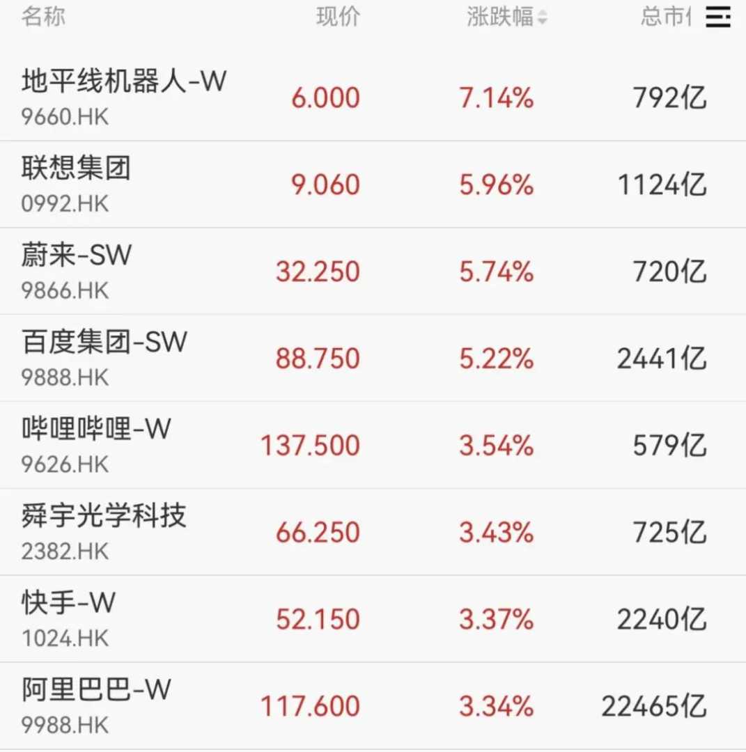 港股三大指数均涨超1%,地平线机器人、联想集团、蔚来、百度等科技股均涨超5%,股市科技板块表现亮眼。