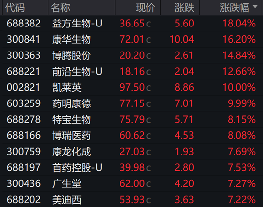 成份股中,凯莱英和药明康德涨停,封单量可观。益方生物-U、康华生物、博腾股份、前沿生物-U等涨幅显著;特宝生物、博瑞医药、康龙化成等多股跟涨,市场热情高涨。