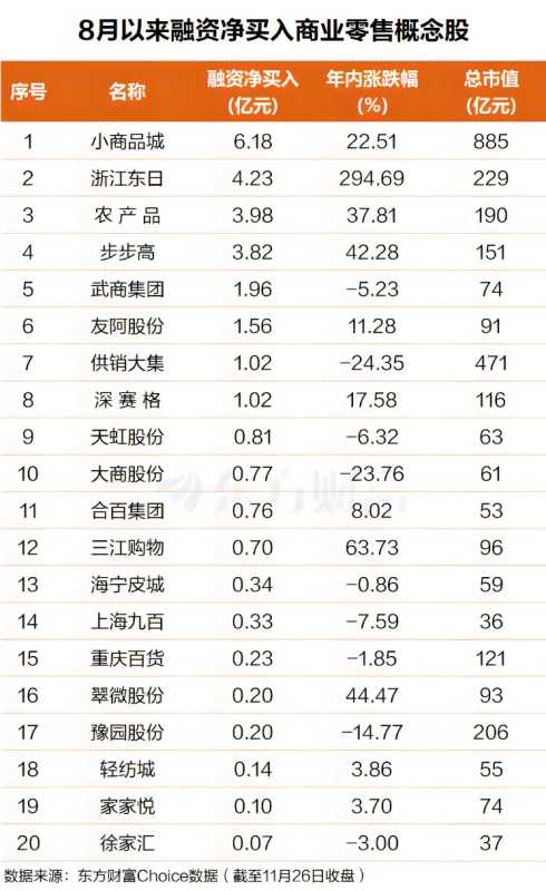 东方财富Choice数据显示,自今年8月以来,杠杆资金净买入多只商业零售概念股,小商品城排名第一,融资净买入超6亿元;浙江东日排名第二,融资净买入超4亿元。