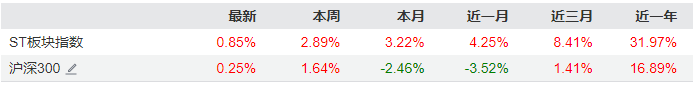 今年以来,ST板块整体涨幅超30%,显著跑赢沪深300指数,有17家公司股价翻倍;进入10月后,其涨势更加迅猛,其中ST中迪、*ST东易股价翻倍,*ST合纵、*ST原尚、*ST新元等多股股价涨超50%。