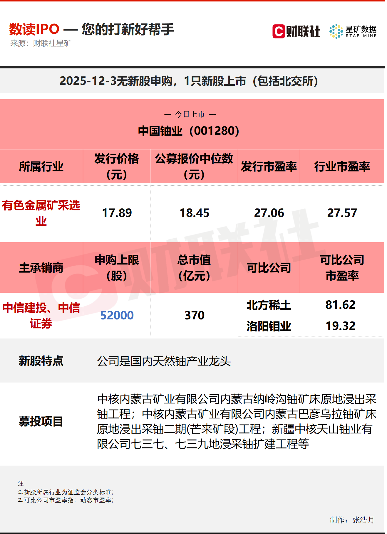 财联社12月3日讯,今日无新股申购,有1只新股上市,为深交所的中国铀业。