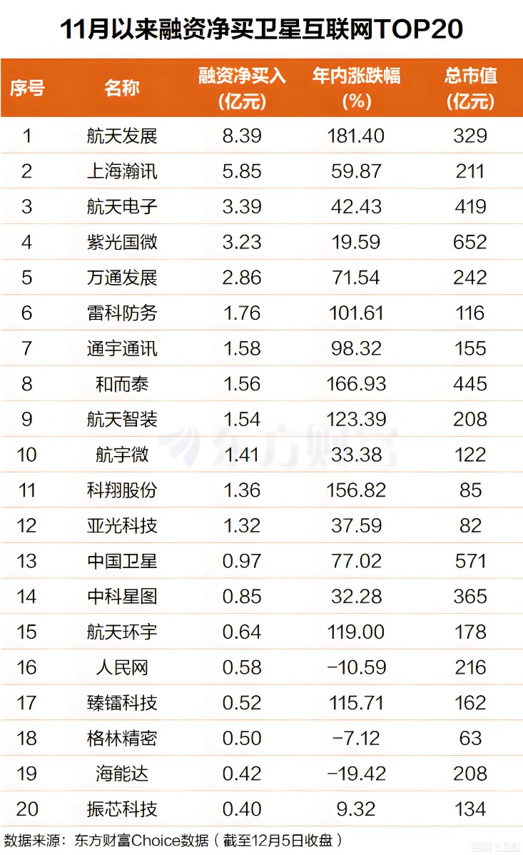 东方财富Choice数据显示,今年11月以来,杠杆资金抢筹多只卫星互联概念,航天发展排名第一,融资净买入超8亿元;上海瀚讯排名第二,融资净买入近6亿元。