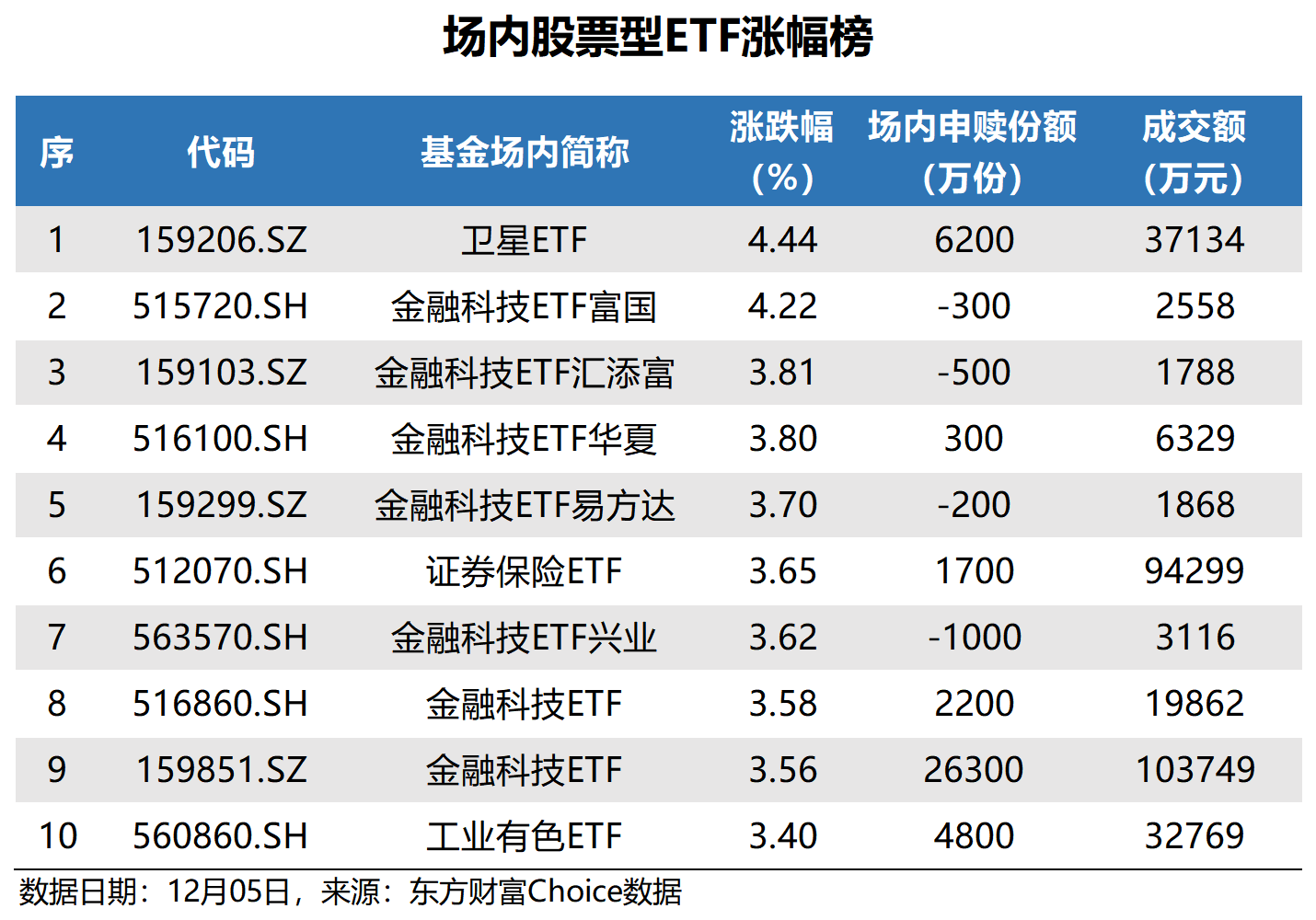 数据显示,上周五场内股票型ETF中,卫星ETF、金融科技ETF富国、金融科技ETF汇添富涨幅居前。其中,卫星ETF涨幅最大,为4.44%。