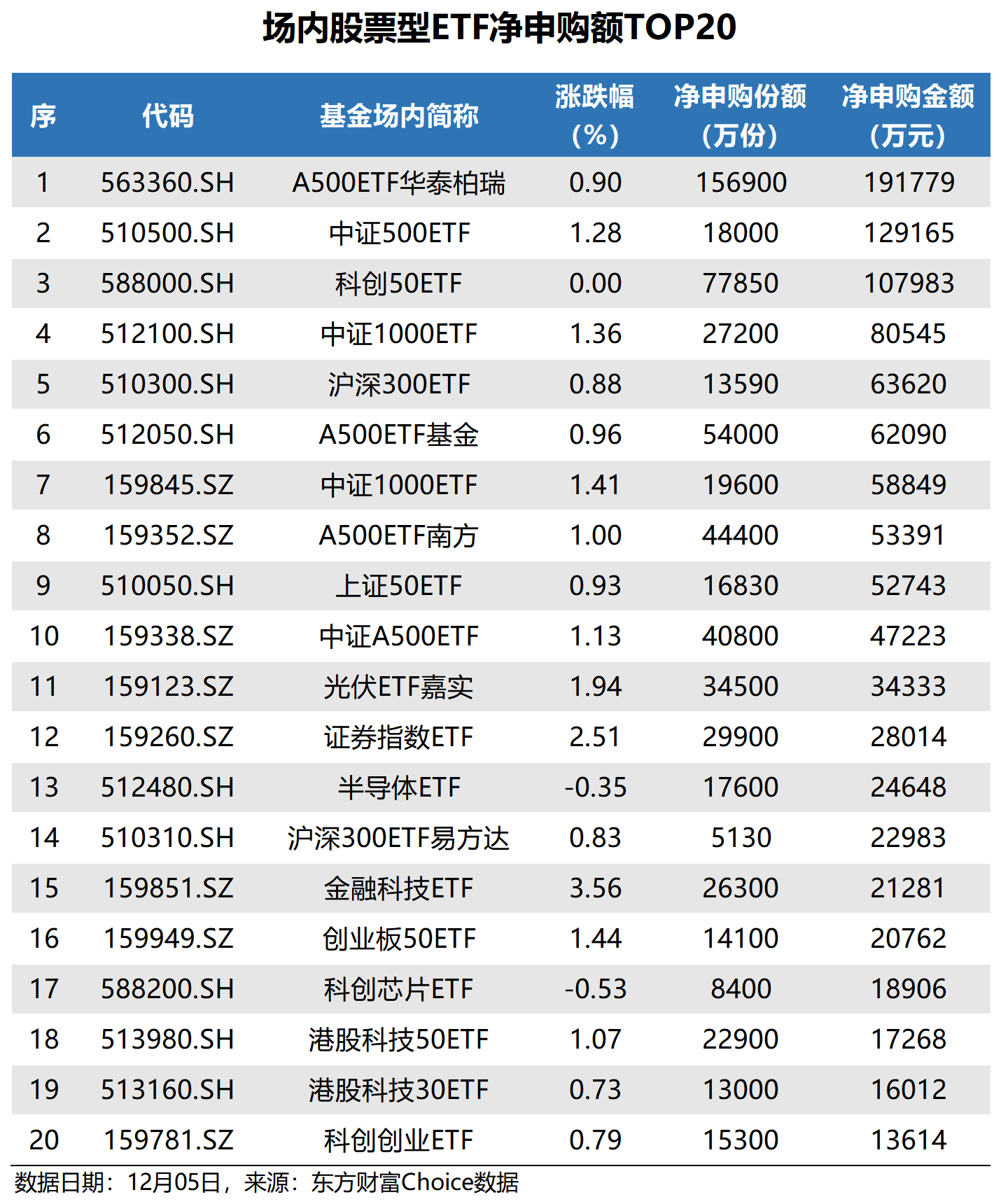 上周五,净申购金额最多的为A500ETF华泰柏瑞,净申购金额为19.18亿元。此外,中证500ETF和科创50ETF也获购居前,净申购金额依次为12.92亿元和10.80亿元。