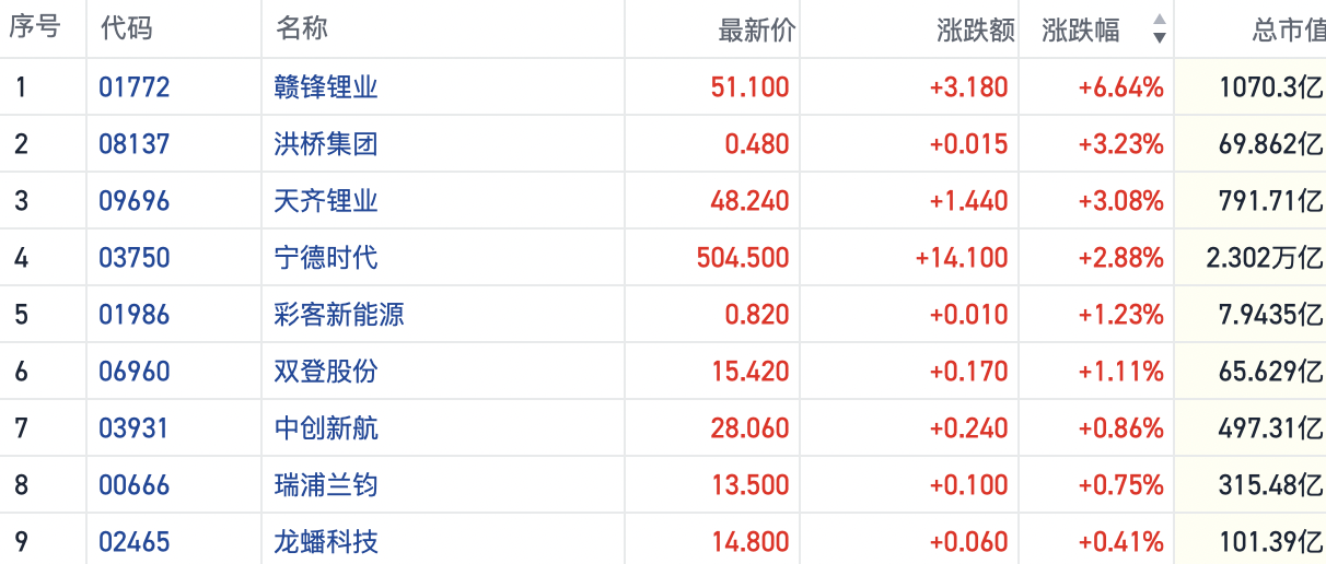 截至发稿,赣锋锂业(01772.HK)大涨超6%,宁德时代(03750.HK)、天齐锂业(09696.HK)等龙头个股也均跟涨约3%左右。