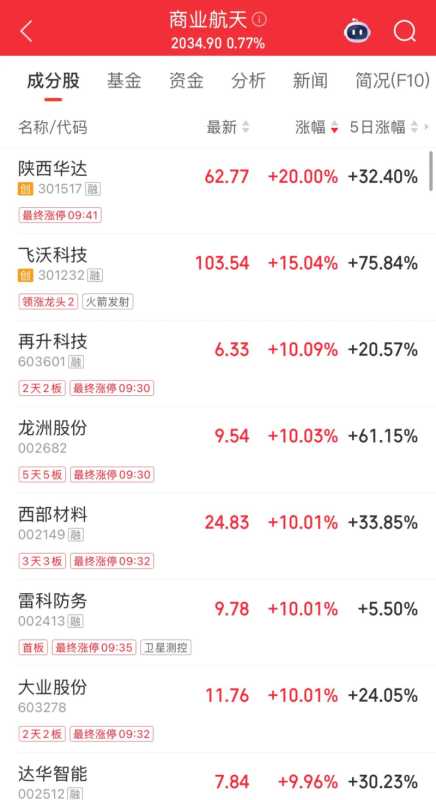 早盘,商业航天概念延续强势。截至发稿,龙洲股份(002682)5连板,西部材料3连板,陕西华达“20cm”涨停,再升科技、雷科防务等多股涨停。