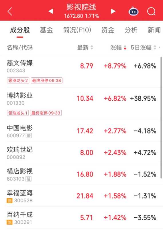 影视板块盘初活跃,慈文传媒、博纳影业触及涨停,中国电影、幸福蓝海、欢瑞世纪、横店影视等跟涨。消息面上,灯塔专业版数据显示,截至12月8日,《疯狂动物城2》在中国内地的票房已突破30亿元。