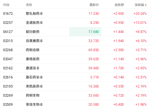 受市场利好提振,港股医药股周二走强。截至发稿,歌礼制药-B(01672.HK)涨20.24%、圣诺医药-B(02257.HK)涨13.01%、昭衍新药(06127.HK)涨8.87%、药明合联(02268.HK)涨3.71%。