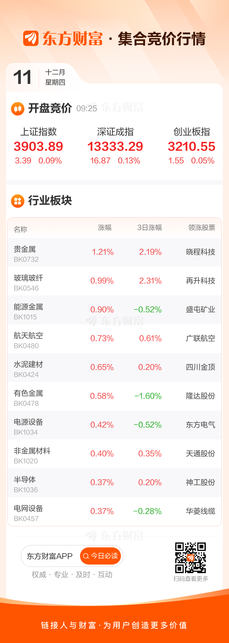 12月11日,三大指数集体高开,贵金属领涨。晓程科技涨1.98%,玻璃玻纤、能源金属等开盘涨幅居前。个股方面,3股竞价涨停。市场焦点股龙洲股份等多股高开。