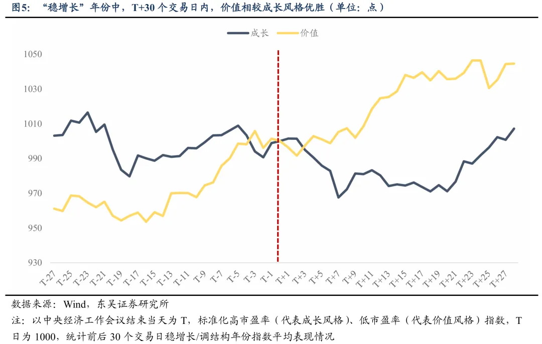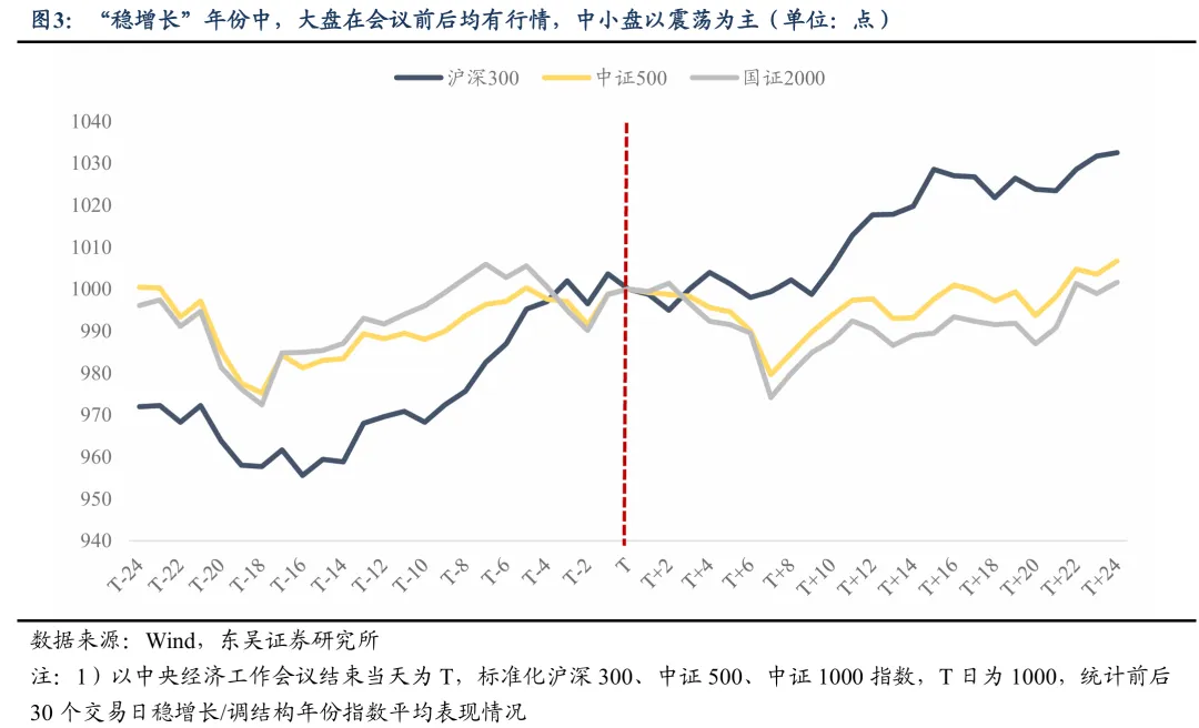 “稳增长”年份指数通常会走强,大盘优于中小盘,价值优于成长。中央经济工作会议定调偏向“稳增长”时,政策预期升温,市场风险偏好也将同步改善,指数中枢上行。此时资金更青睐金融、消费等顺周期权重,进而形成大盘优于小盘、价值优于成长的格局。