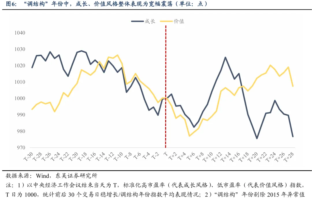 “调结构”年份指数偏向震荡,大盘走平而中小盘走弱,价值风格低位回升、相对成长风格跑出超额收益。中央经济工作会议定调偏向“调结构”时,市场预期收敛,同时“调结构”年份关注的去杠杆、防风险、强监管等内容也会对市场风险偏好有一定压制,因此中小盘会明显走弱。在防御思维下,价值风格表现出韧性,而成长风格仅有脉冲式上涨。