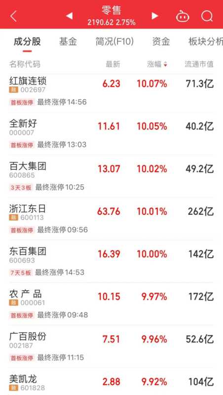 今天,这两大板块继续上涨。具体看,零售板块中,红旗连锁、全新好、百大集团等个股涨停,其中,百大集团迎来3连板。