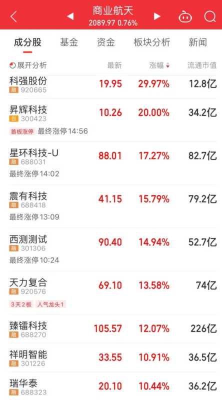 商业航天板块是最近人气最高的板块,今天,航天电子、航天机电、航天信息等热门股掀起涨停潮。此外,多只个股今天盘中股价创出历史新高,如,超捷股份、西部材料、上海瀚讯、斯瑞新材等。